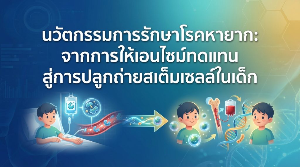 นวัตกรรมการรักษาโรคหายากได้เดินทางมาไกลอย่างน่าอัศจรรย์ จากการให้เอนไซม์ทดแทนที่ช่วยประคับประคองอาการ สู่การปลูกถ่ายสเต็มเซลล์ในเด็กที่มอบโอกาสในการหายขาด และอนาคตของยีนบำบัดและการแพทย์แม่นยำที่กำลังจะพลิกโฉมการรักษาไปตลอดกาล เทคโนโลยีเหล่านี้ไม่ได้เป็นเพียงแค่ความก้าวหน้าทางการแพทย์เท่านั้น แต่ยังเป็นแสงสว่างแห่งความหวังให้กับเด็กๆ และครอบครัวที่ต้องต่อสู้กับโรคหายาก การสนับสนุนงานวิจัยและพัฒนา รวมถึงการเข้าถึงการรักษาที่ทันสมัย จึงเป็นกุญแจสำคัญในการยกระดับคุณภาพชีวิตและมอบอนาคตที่สดใสให้กับผู้ป่วยโรคหายากทุกคน