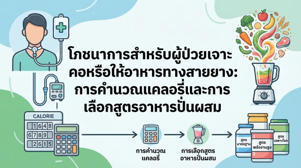 เรียนรู้หลักการโภชนาการสำหรับผู้ป่วยเจาะคอหรือให้อาหารทางสายยาง พร้อมวิธีคำนวณแคลอรี การเลือกและเตรียมสูตรอาหารปั่นผสมที่บ้านเพื่อสุขภาพที่ดีของผู้ป่วย