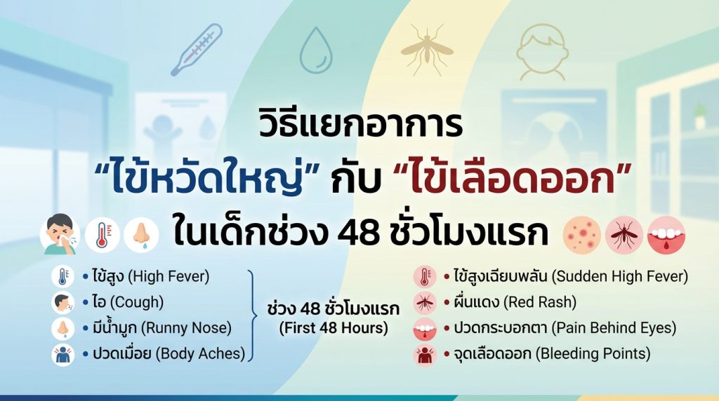 การแยก อาการไข้หวัดใหญ่กับไข้เลือดออกในเด็กช่วง 48 ชั่วโมงแรก เป็นเรื่องที่ท้าทาย แต่การสังเกตความแตกต่างอย่างละเอียด โดยเฉพาะอย่างยิ่งการมีหรือไม่มีอาการระบบทางเดินหายใจ (ไอ, น้ำมูก) และลักษณะของไข้ (ไข้สูงเฉียบพลัน vs. ไข้สูงลอย) จะเป็นจุดเริ่มต้นที่ดีที่สุด หากคุณพ่อคุณแม่มีความไม่แน่ใจหรือลูกมี อาการน่าสงสัยในเด็ก ที่รุนแรงขึ้น อย่าลังเลที่จะพาไปพบแพทย์ เพื่อให้บุตรหลานได้รับการดูแลที่ถูกต้องและปลอดภัยที่สุด