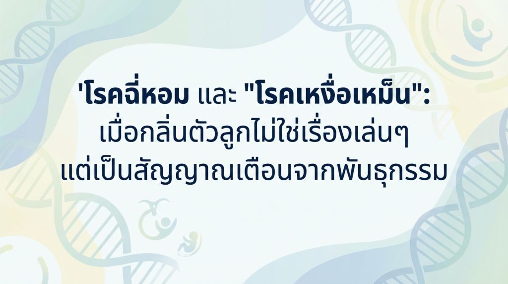 สำหรับคุณพ่อคุณแม่ สิ่งหนึ่งที่มักจะสร้างความกังวลใจได้ไม่น้อย คือเรื่องของสุขอนามัยและสุขภาพของลูกน้อย โดยเฉพาะอย่างยิ่งเมื่อสังเกตเห็นถึง กลิ่นตัวลูก ที่ผิดปกติไป ไม่ว่าจะเป็นกลิ่นฉุน กลิ่นแปลกๆ หรือแม้กระทั่ง กลิ่นปากเหม็นคาวปลา ที่ไม่เหมือนใคร หลายครั้งเราอาจคิดว่าเป็นเรื่องของสุขอนามัยที่ไม่ดีพอ หรือเป็นกลิ่นเหงื่อตามปกติ แต่รู้หรือไม่ว่า ในบางกรณี กลิ่นเหล่านี้อาจเป็นสัญญาณเตือนจากร่างกายว่าลูกกำลังเผชิญกับภาวะทาง โรคพันธุกรรม ที่ซับซ้อน และจำเป็นต้องได้รับการดูแลอย่างเร่งด่วน บทความนี้จะพาทุกท่านไปทำความรู้จักกับ โรคฉี่หอม (Maple Syrup Urine Disease – MSUD) และ โรคเหงื่อเหม็น (Trimethylaminuria – TMAU) สองภาวะที่ไม่ควรมองข้าม เมื่อกลิ่นตัวลูกไม่ใช่เรื่องเล่นๆ อีกต่อไป